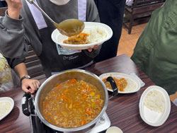 エプロン三角巾を身につけ、しっかりと手を洗ってから調理を開始。子ども達の年齢層は幅広く、中には料理に不慣れな子もいましたがどの班も協力してカレー作りをしていました。1班につき10人前のカレーを作りましたが、おかわりする子も多く綺麗に完食していました。